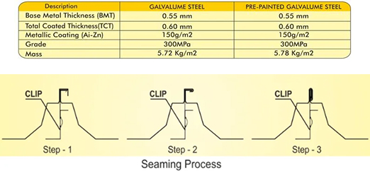 STEEL: The strength and formability of steel makes it an ideal material for Roof and Wall panels. LCP LYCORSEAM® is a cold roll formed Roof and Wall Cladding manufactured from high strength steel of G300 base material (300MPa minimum yield stress), with Galvalume steel (zinc ∓ Aluminium alloy) coating and color coated Galvalume steel.